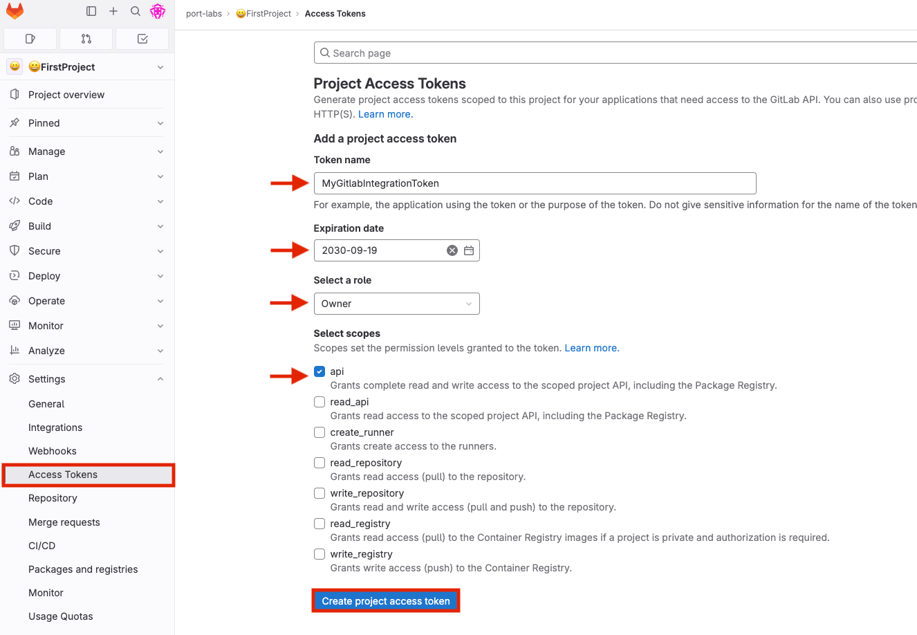2. In the "Access Tokens" section, you need to provide the token details, including the name and an optional expiration date. Additionally, select the api scope, and then proceed to click on the "Create access token" button.