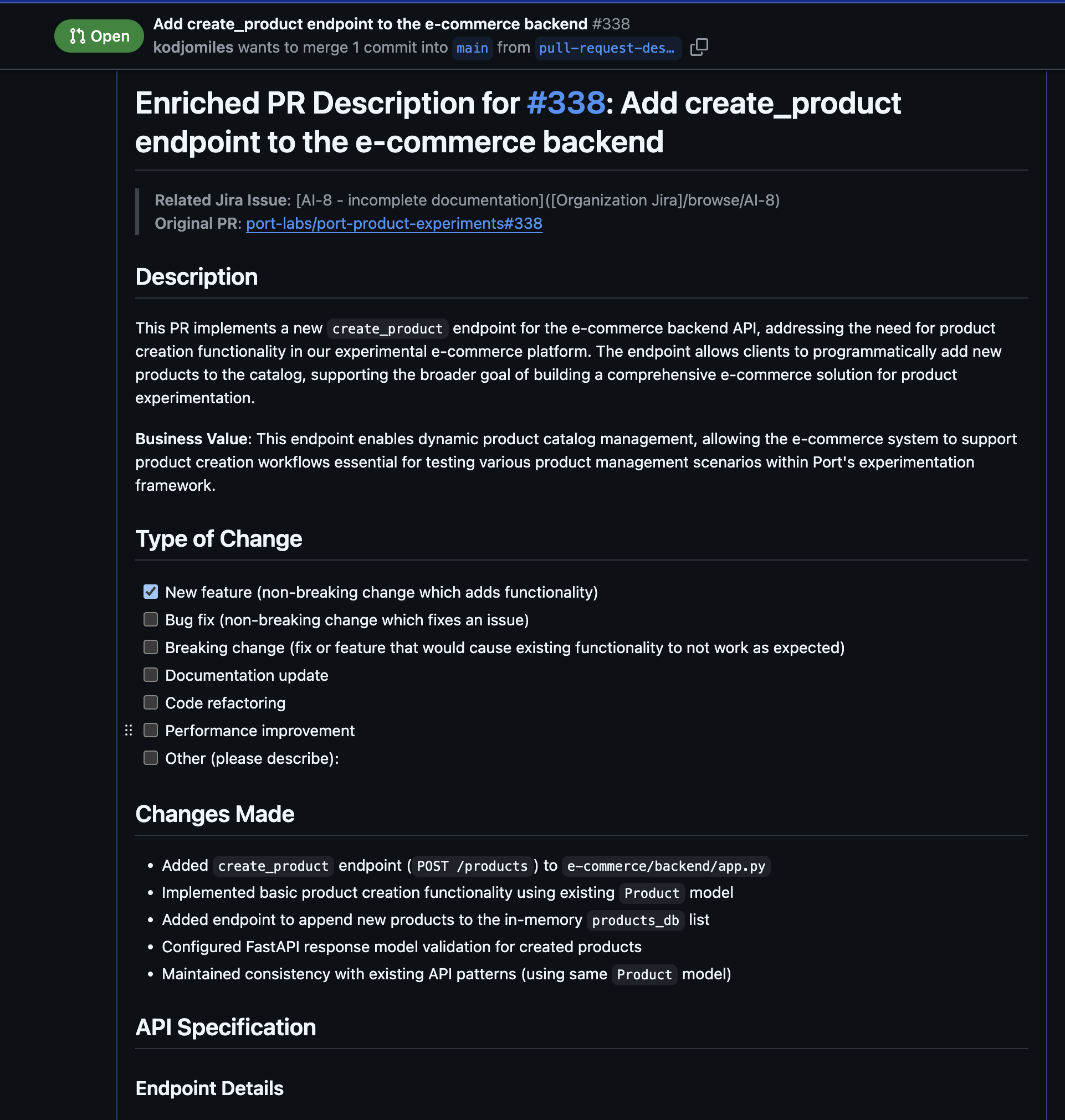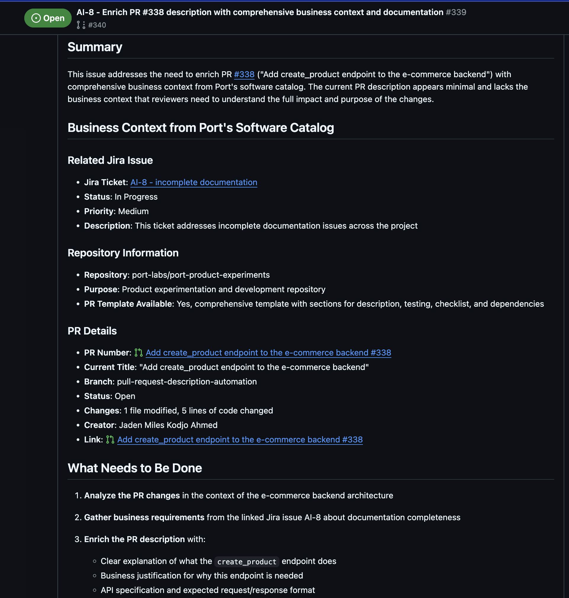 Now let's test the complete setup and see how Port enriches PR descriptions with business context.