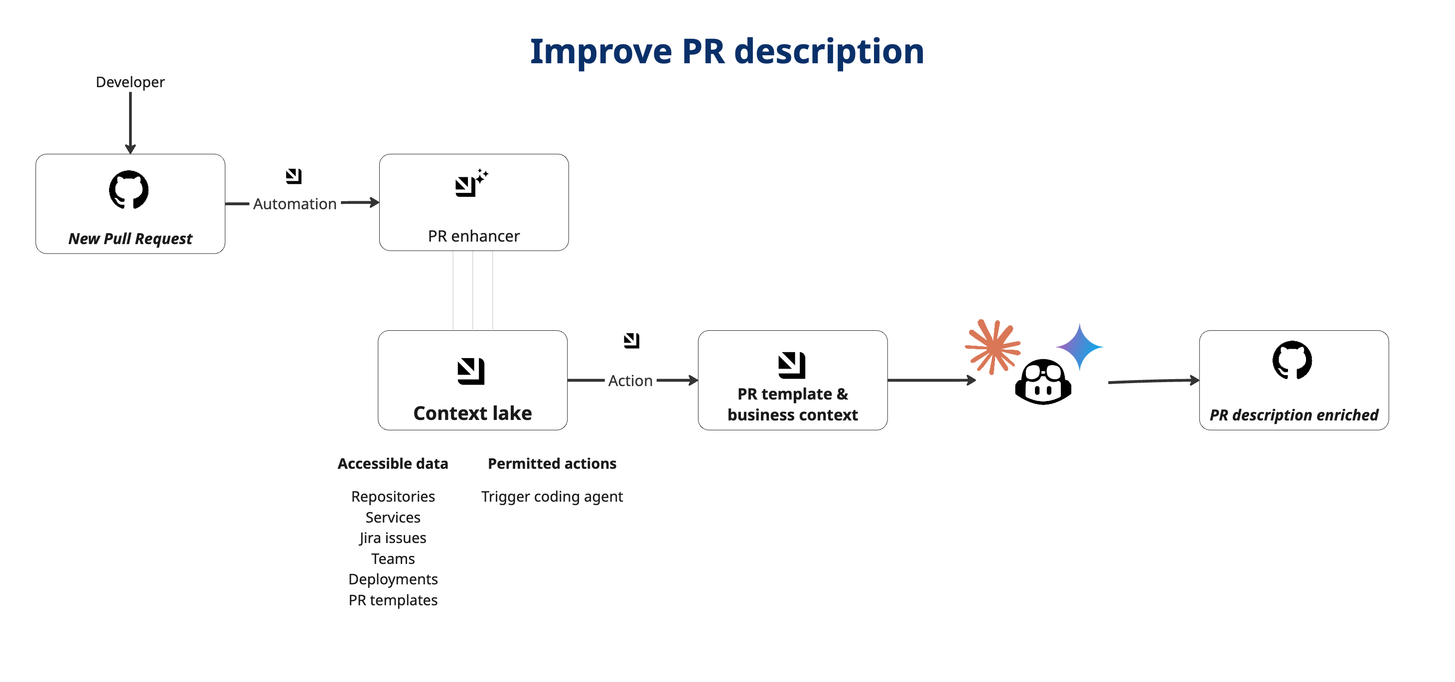 When a PR is created, it is linked to its template, Jira issues, and other related entities in your software catalog. This creates a context lake that can be used to enrich the PR description.