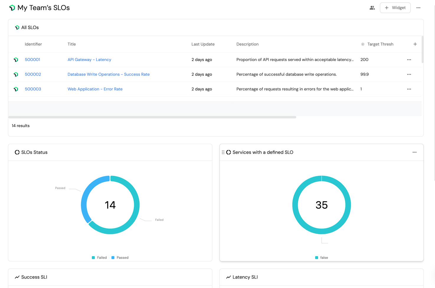 By following this guide, you have successfully set up dashboards to track your services' SLIs and SLOs. These visualizations provide real-time insights into service performance and compliance, allowing your teams to quickly identify and address underperforming services.