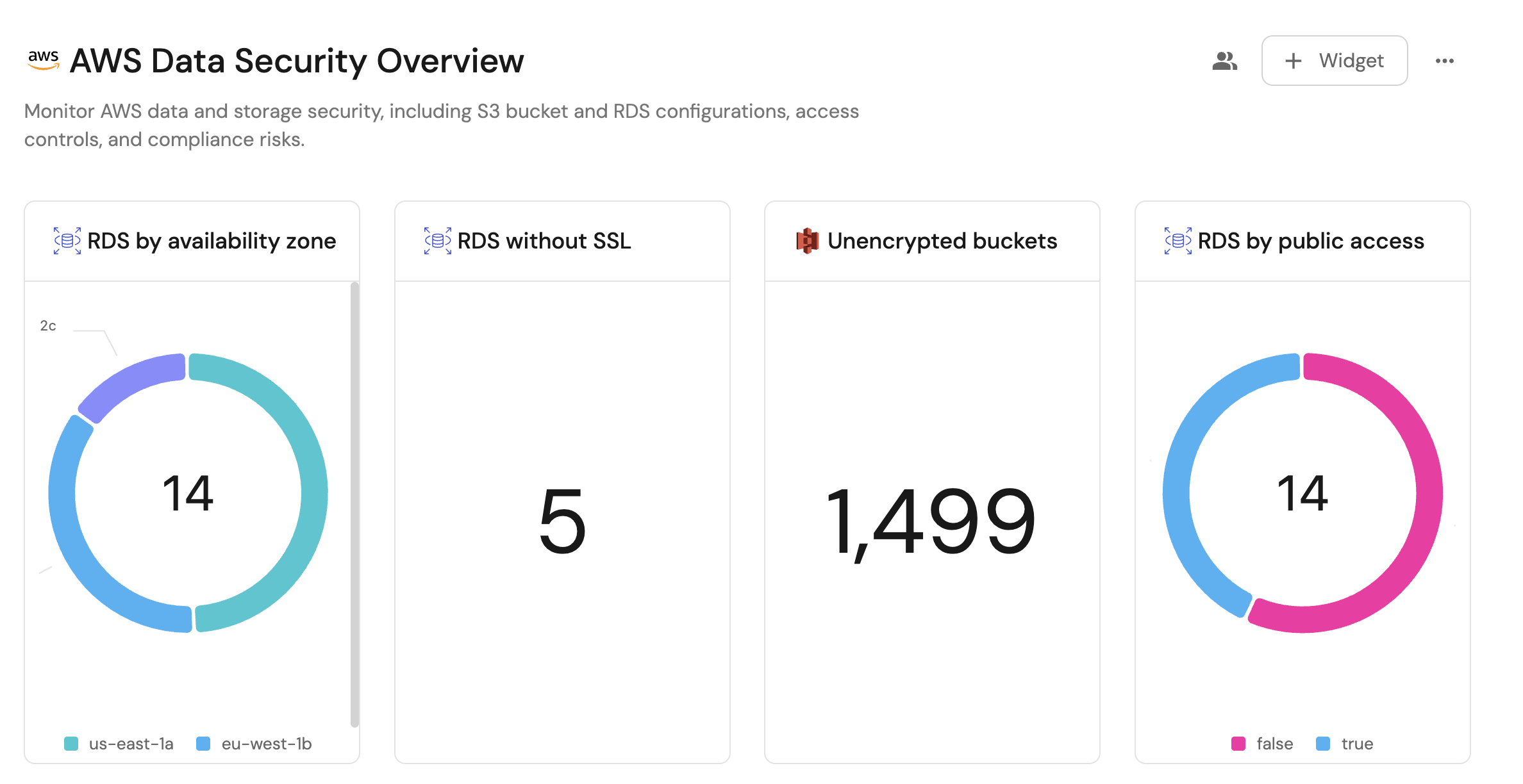 Once the AWS storage data is synced, we can create a dedicated dashboard in Port to monitor and analyze security configurations and access controls using customizable widgets.